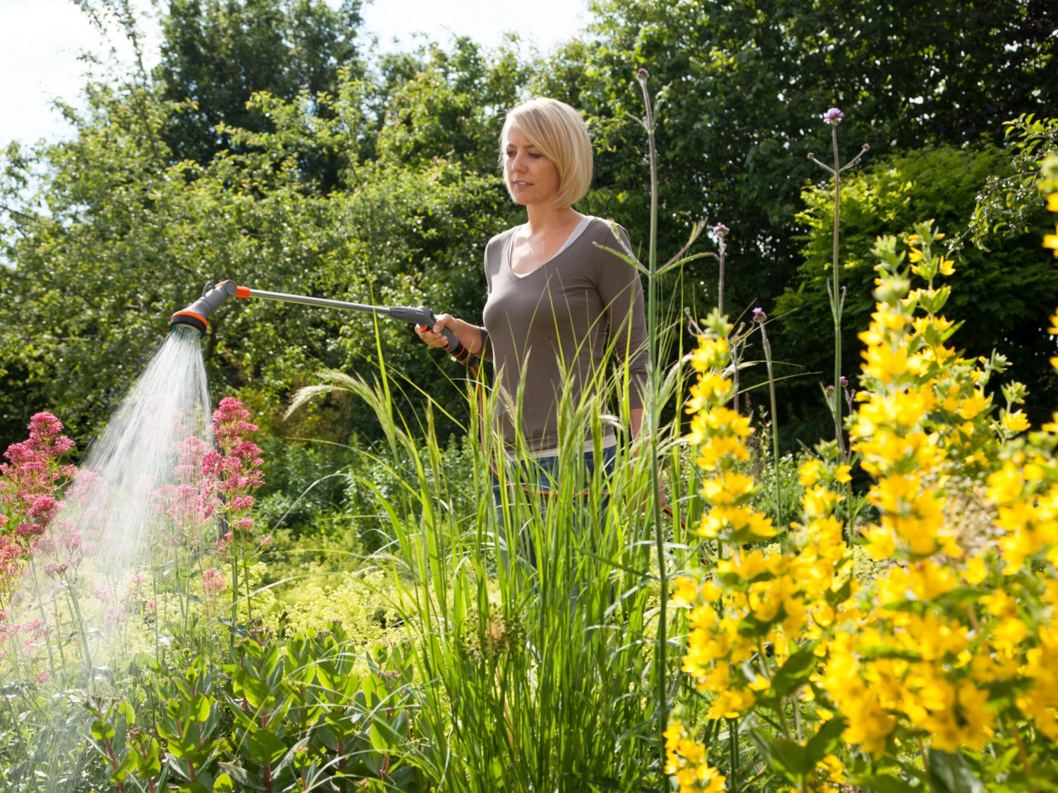 Hanging baskets and plants in remote positions can be watered particularly easily and accurately using the Gardena Comfort Hanging Basket Spray Lance.