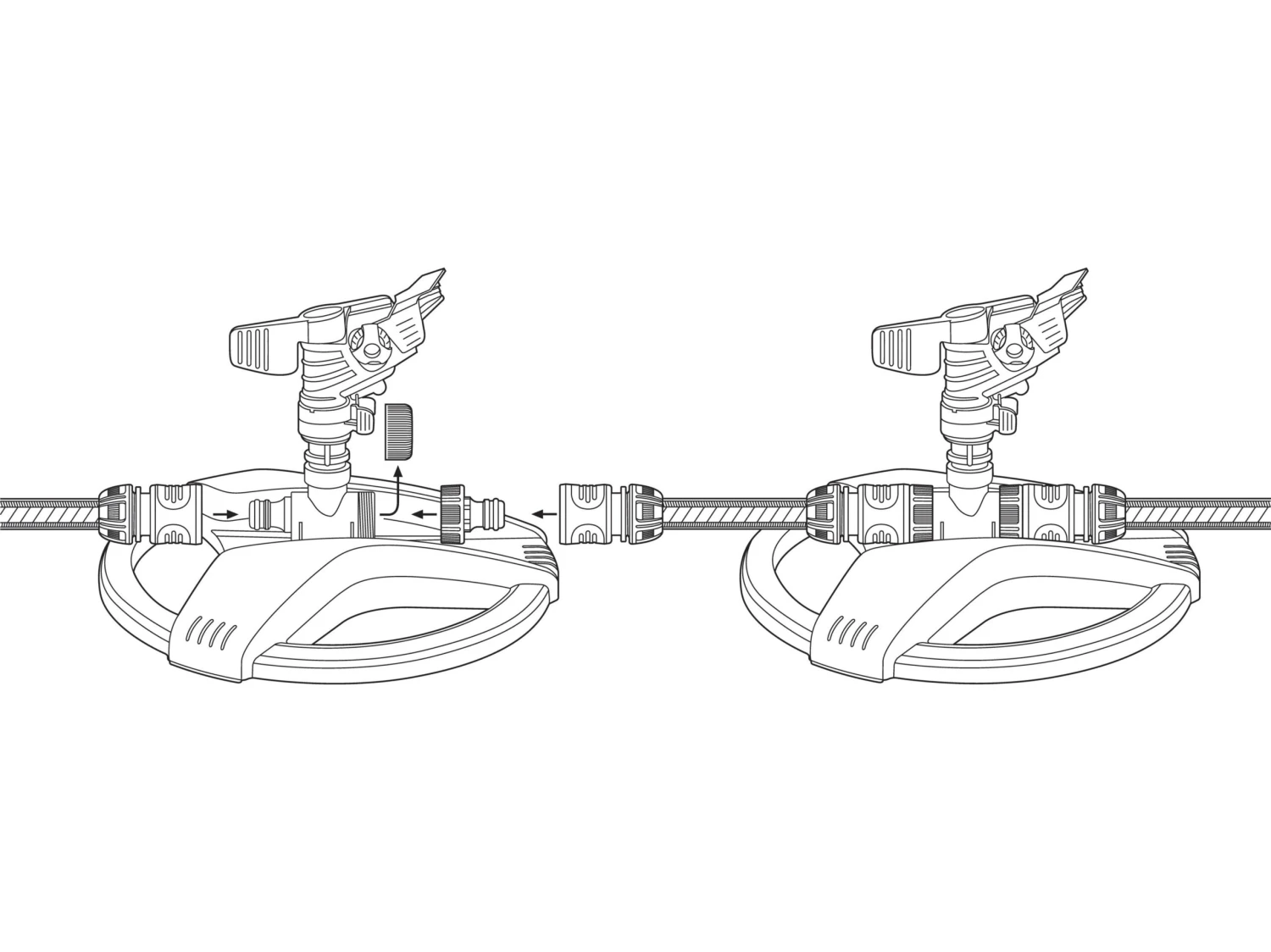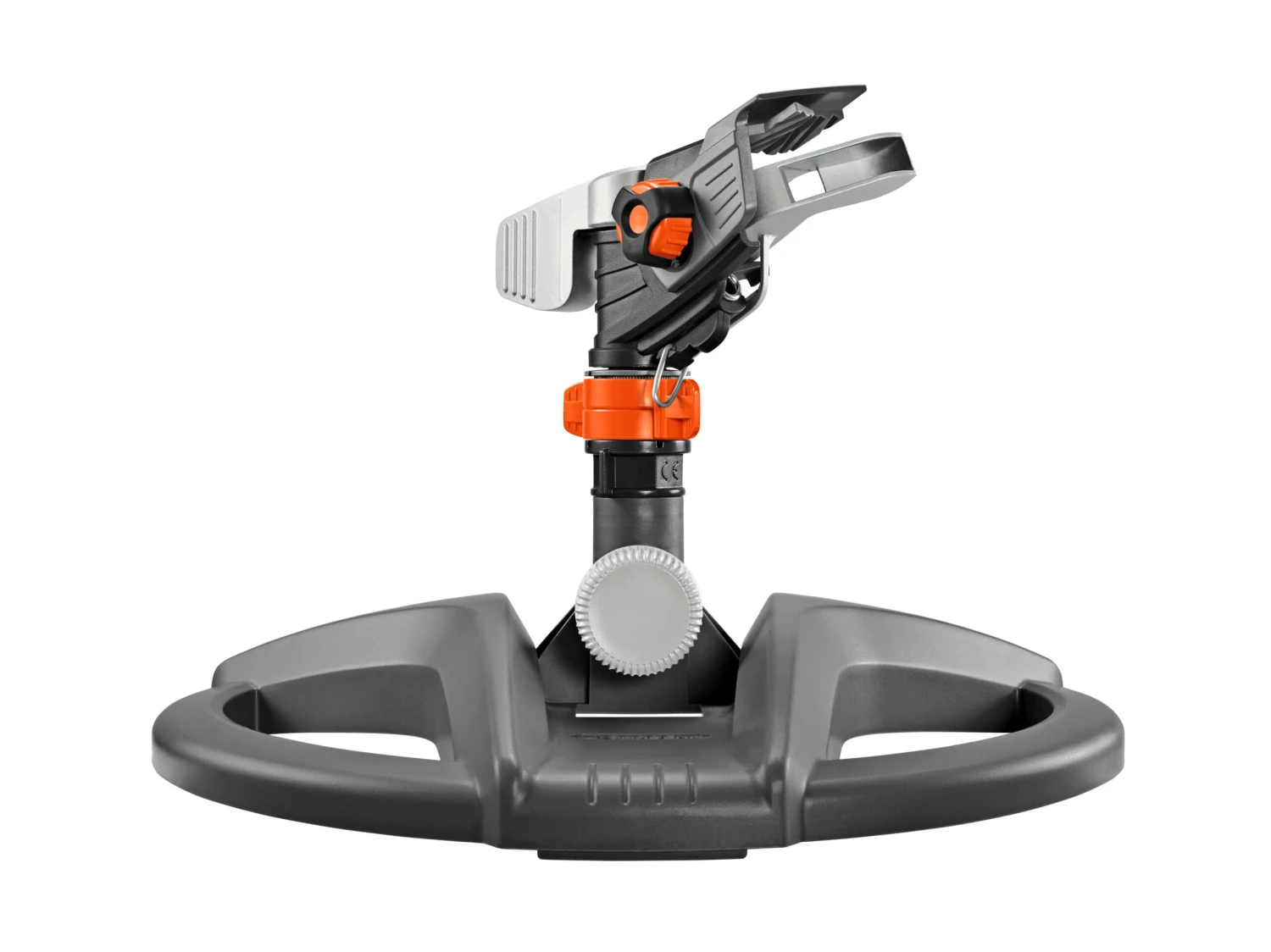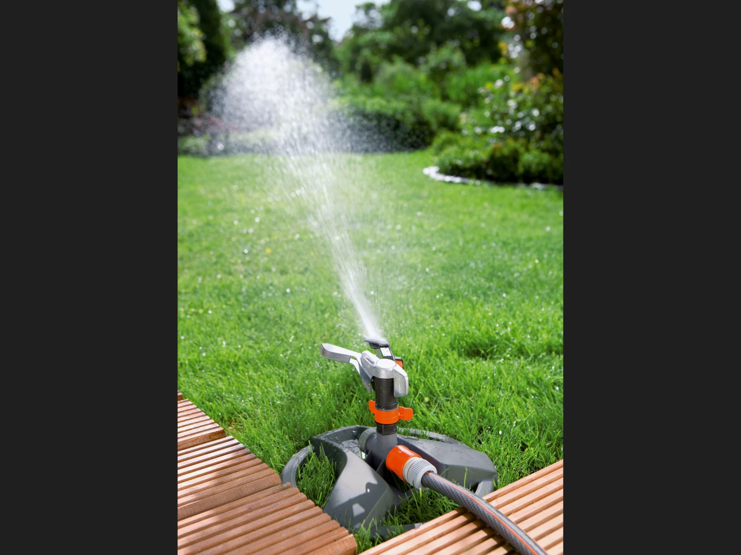 The sprinkler is mounted on a sled. This has three metal inserts that render it highly robust. The sprinkler is equipped with the Gardena System Connector and the end cap. You can use it right away.